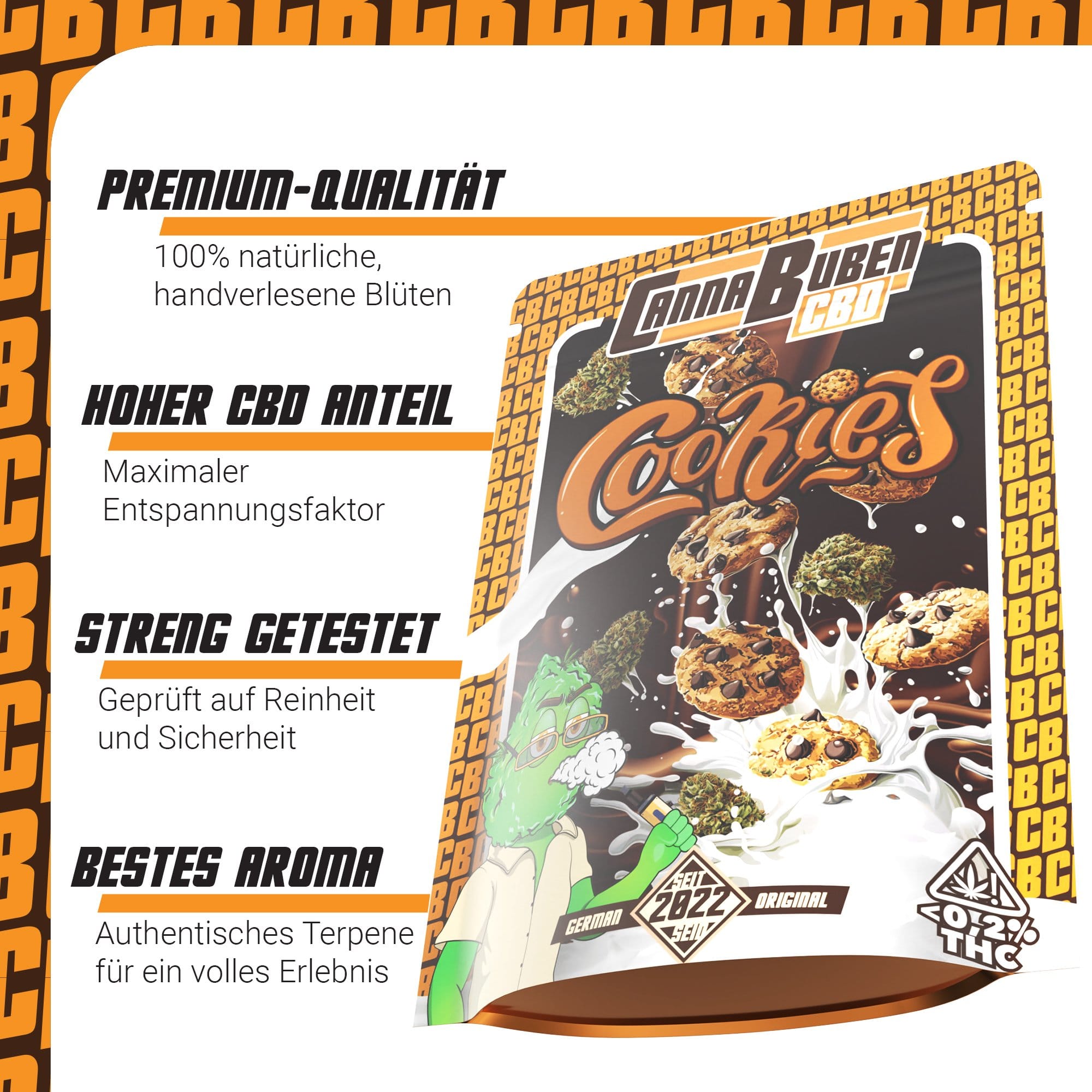 Lass dich von den Cookies CBD-Blüten in eine Welt voller süßer Aromen entführen! Diese Sorte besticht durch einen verführerischen Duft von frisch gebackenen Keksen, kombiniert mit einem subtilen, erdigen Unterton. Perfekt für Genießer, die entspannte Momente mit einem Hauch von Süße suchen.
