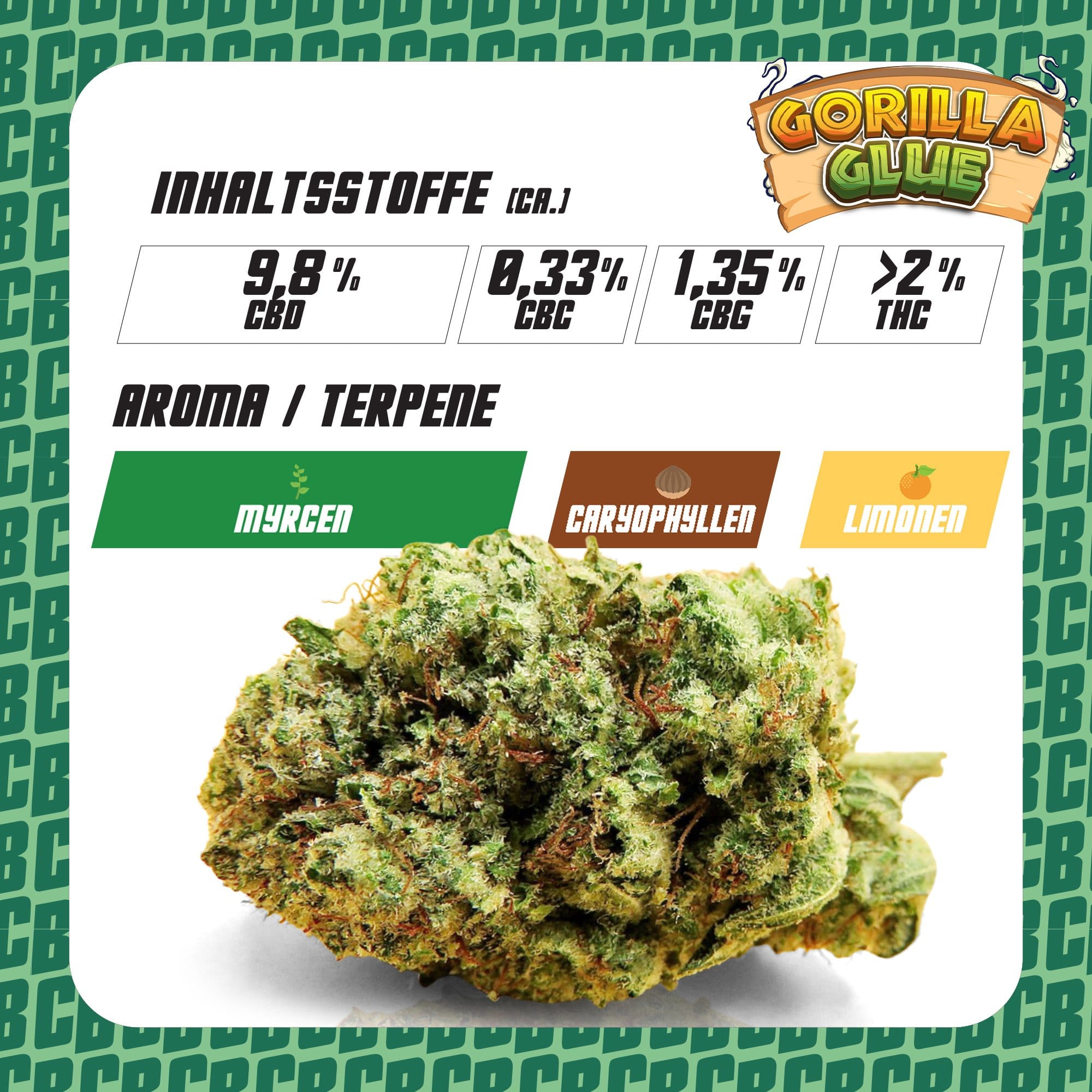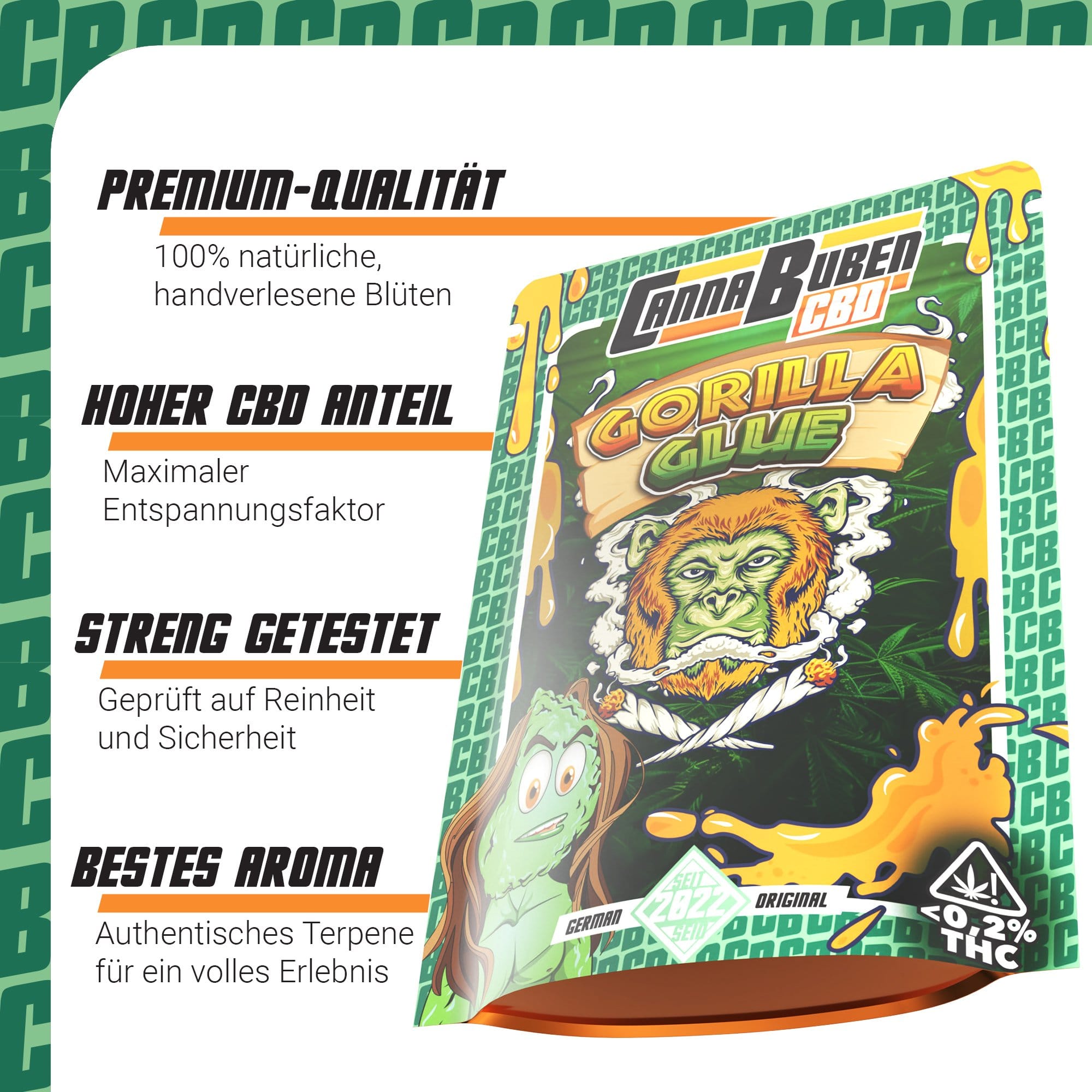 Die Gorilla Glue CBD-Blüten werden unter streng kontrollierten Bedingungen angebaut, ohne den Einsatz von Pestiziden oder chemischen Zusätzen. Jede Blüte wird handverlesen und mit größter Sorgfalt verarbeitet, um ein naturbelassenes und reines Produkt zu garantieren, das höchsten Qualitätsstandards entspricht.