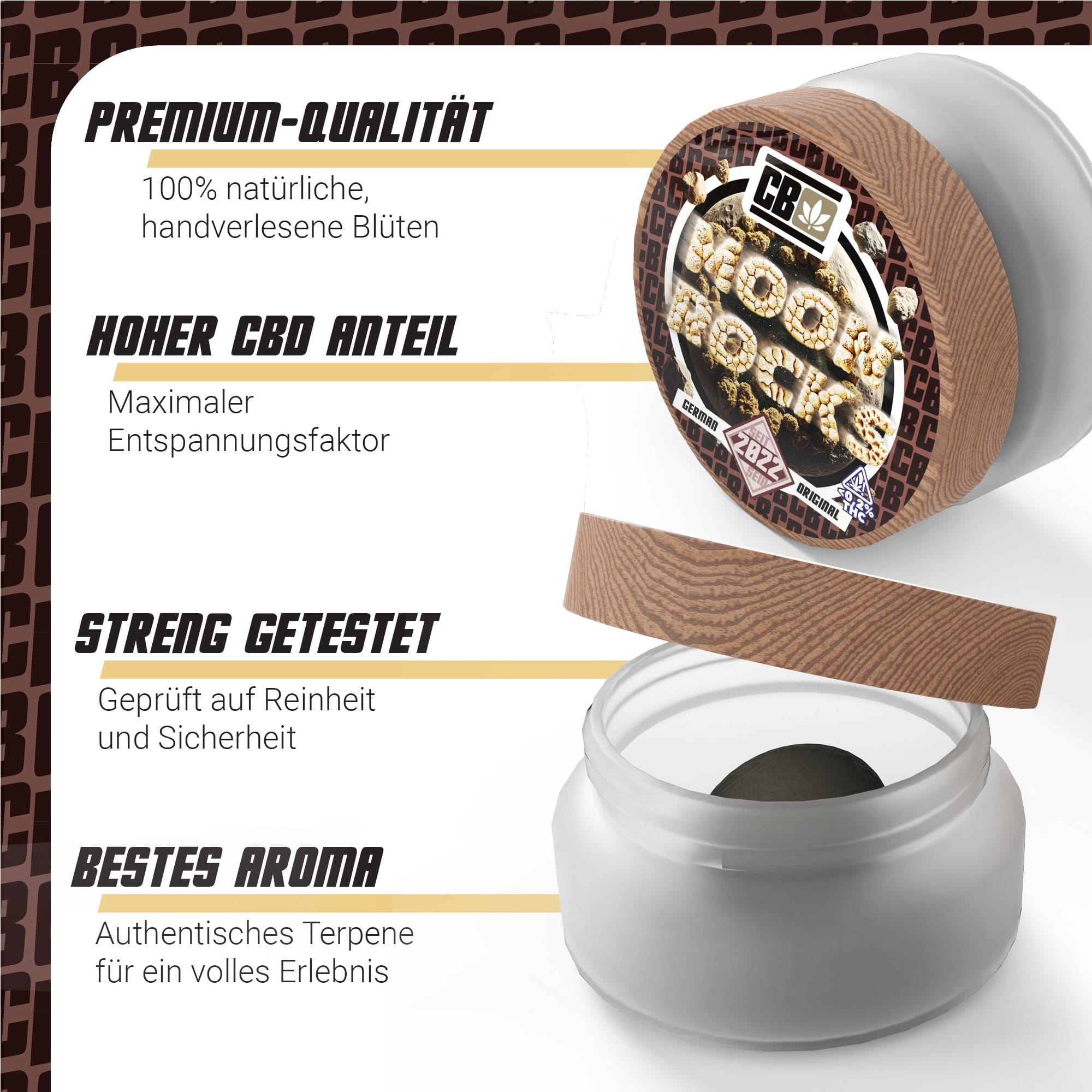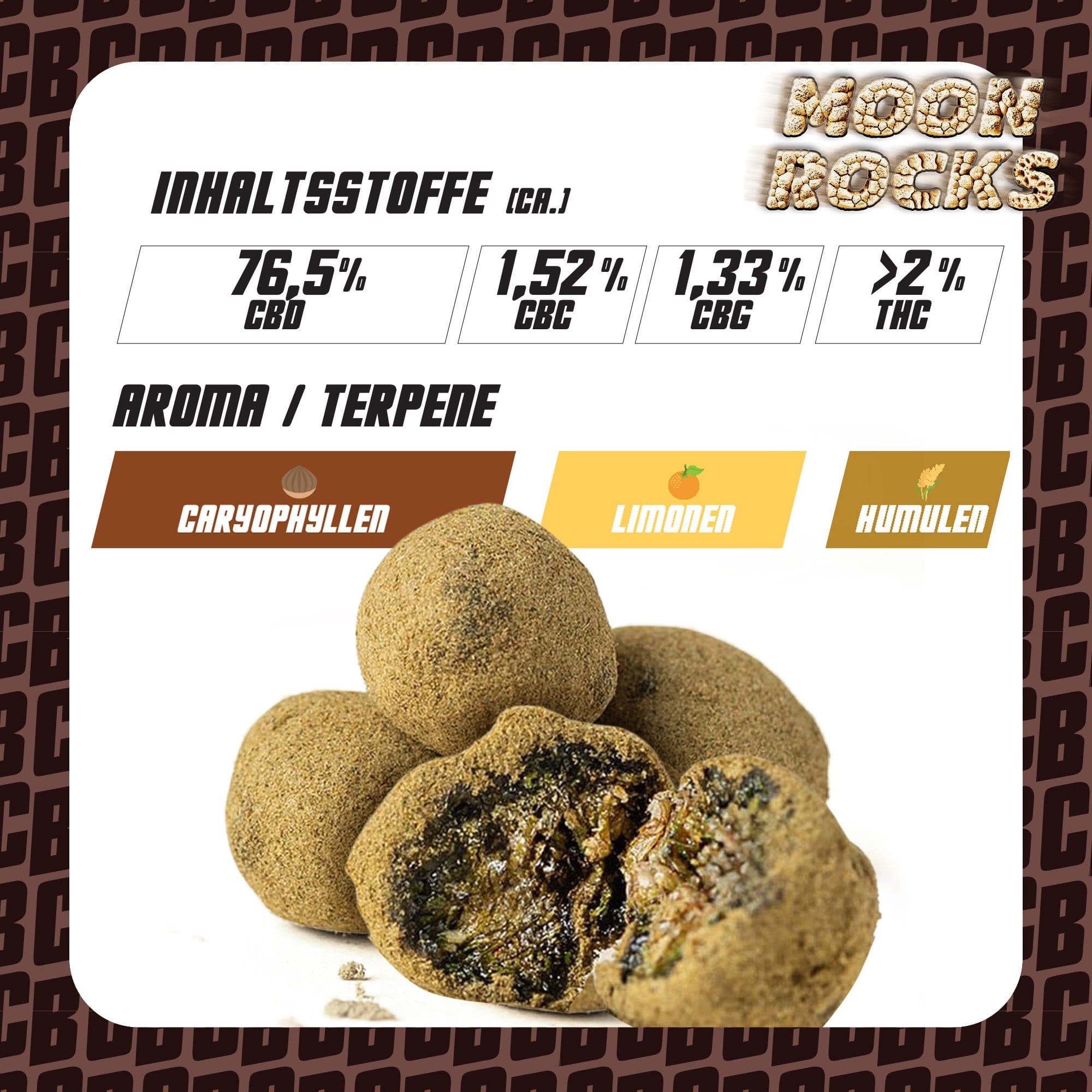 Unsere Moonrocks werden aus den besten CBD-Blüten hergestellt, sorgfältig mit reinem CBD-Extrakt überzogen und abschließend in feinstem Kief gewälzt. Diese dreifache Veredelung garantiert höchste Reinheit, maximalen CBD-Gehalt und ein unvergleichliches Produkt für anspruchsvolle Genießer.